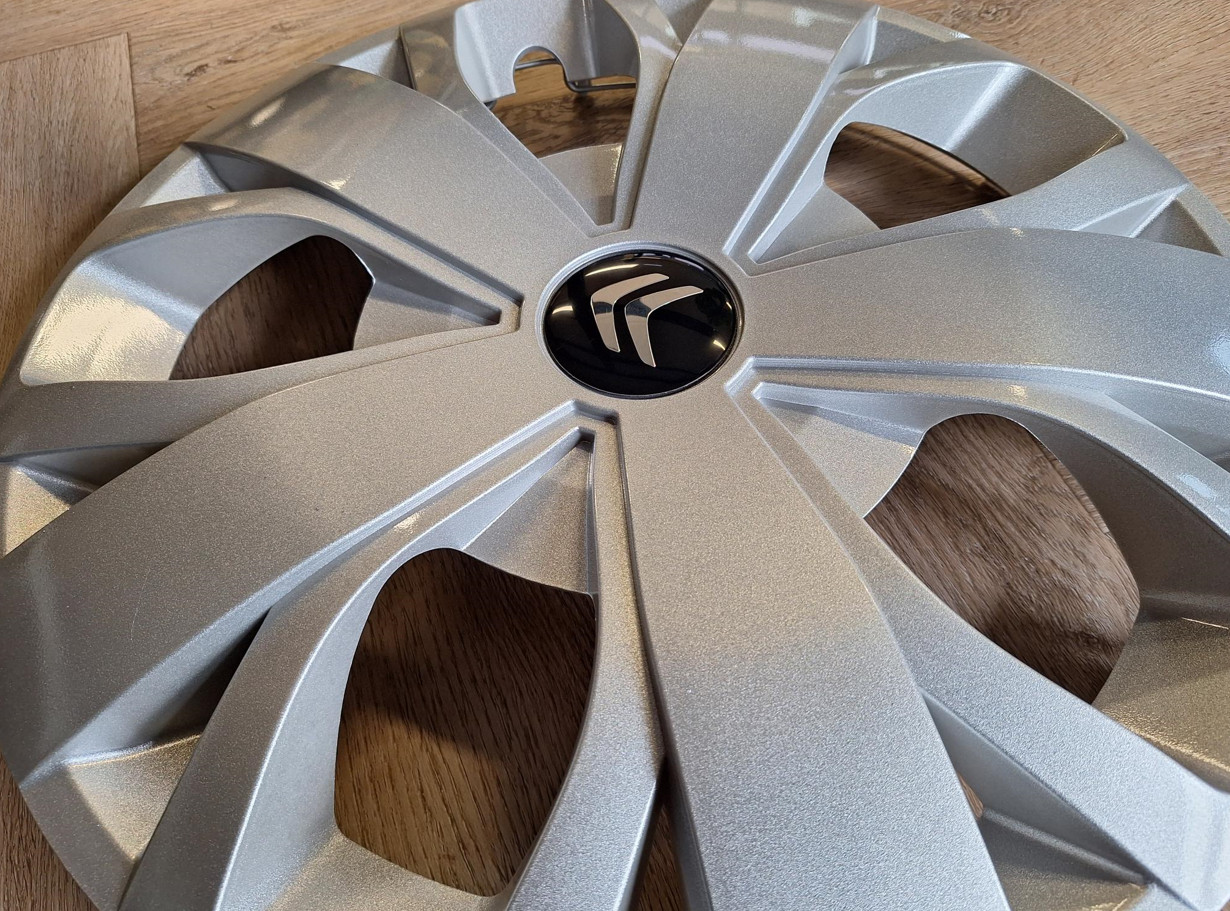 Complete wieldoppen voor de Citroën Jumper, 16 inch, uitgevoerd in zilver met ring en Citroën-logo. Gemaakt van buigbaar kunststof (ABS/PP mix) en voorzien van meerdere lagen zilverkleurige coating voor een diepe, glanzende uitstraling.